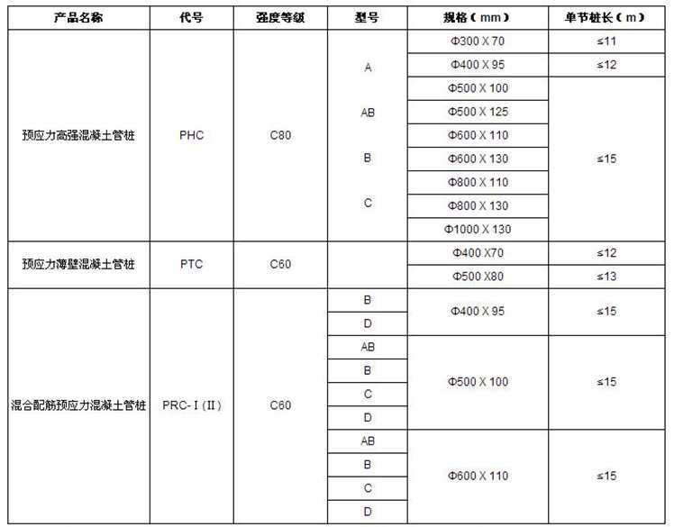 業臻管樁集團生產各類預應力混凝土管樁,直徑范圍300mm-1000mm,管樁壁厚度一般在70mm至130mm,長度主要在5m至15m之間。業臻管樁生產的預應力混凝土管樁(PHC)、預應力薄壁管樁(PTC)、以及混合配筋預應力混凝土管樁(PRC-Ⅰ(Ⅱ)),可滿足客戶不同項目所在區域的環境與地質狀況需求。